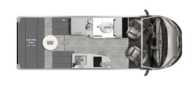 - Water pump, awning, sofa, and vent controls